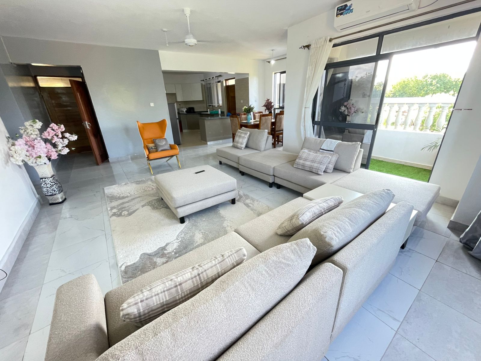 1. Spacious living room with modern sofa, TV, open Dining area with space for 6 people and a balcony.